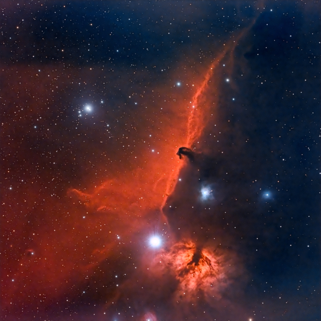 Just east of Alnitak, the iconic Horsehead Nebula emerges—a dark, silhouetted shape resembling a rearing horse, set against the crimson glow of hydrogen gas. Nearby, the Flame Nebula flickers like an otherworldly bonfire, its fiery plumes intertwined with dark lanes of dust. These dramatic contrasts of light and shadow define the eastern edge of Orion’s great molecular cloud complex.