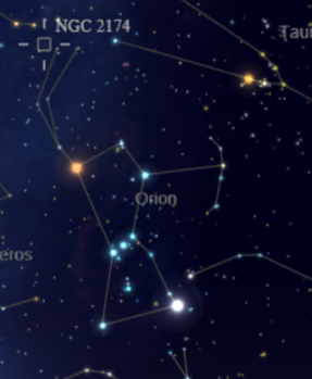 NGC 2174, popularly known as the Monkey Head Nebula, is an expansive emission nebula located in the constellation Orion, near the border with Gemini and not far from the bright star Betelgeuse. The nebula lies at a distance of roughly 6,400–6,500 light-years from Earth and spans more than 50 light-years across. Its nickname comes from the characteristic profile formed by dark dust lanes cutting into the glowing gas, which in deep images resembles the face of a monkey looking off to the side.