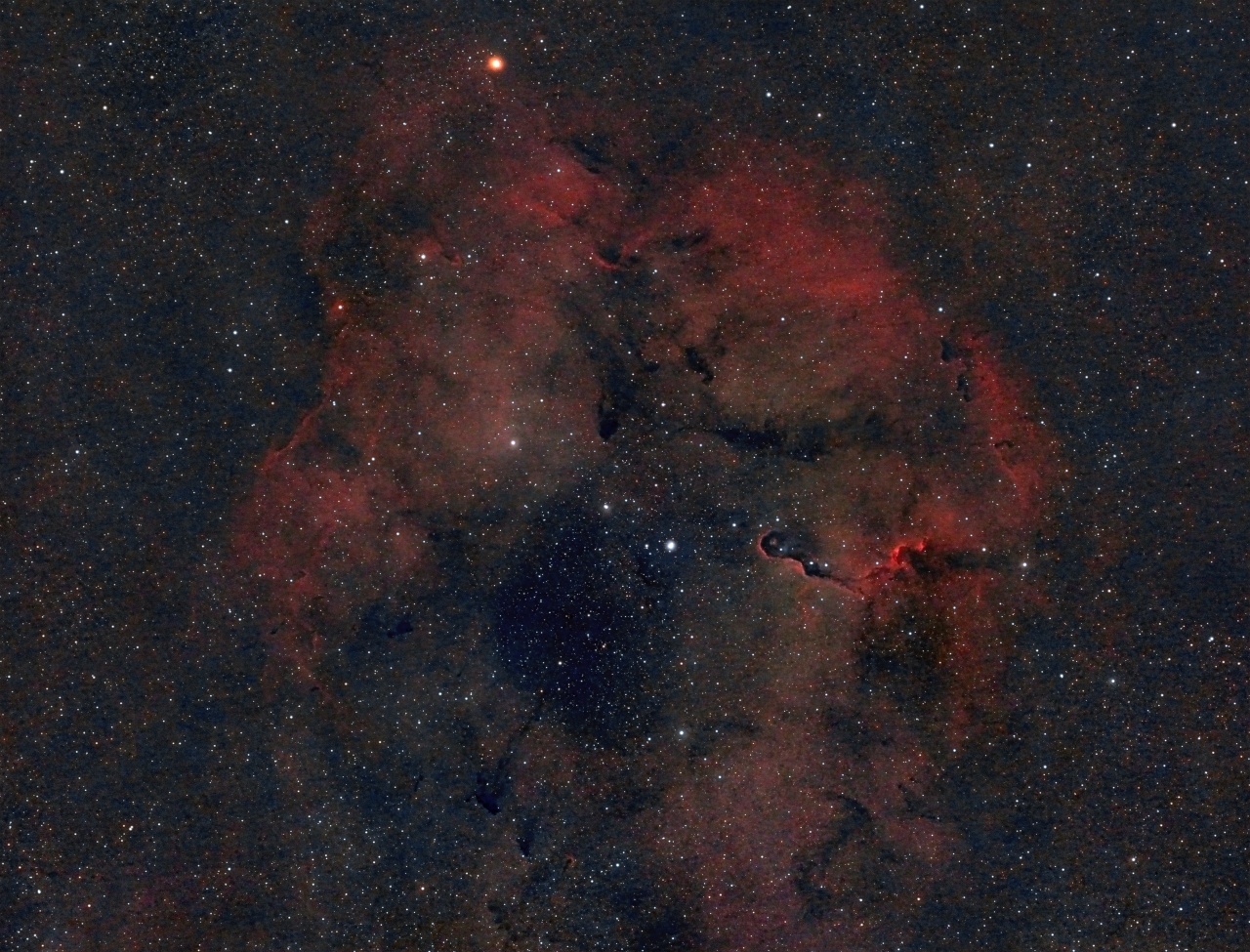 VIC 1396 is a sprawling emission nebula and star-forming complex in Cepheus, spanning well over 100 light-years and sitting roughly ~2,400 light-years away. Along its rim lies IC 1396A, the famous Elephant Trunk Nebula—a dense, dusty globule whose dark “trunk” stands out in silhouette against the surrounding glow. The overall scene is a classic H II region: a large volume of interstellar hydrogen gas ionized by nearby massive stars, with pockets of thicker dust and molecular material resisting that radiation long enough to form pillars, globules, and embedded star nurseries.