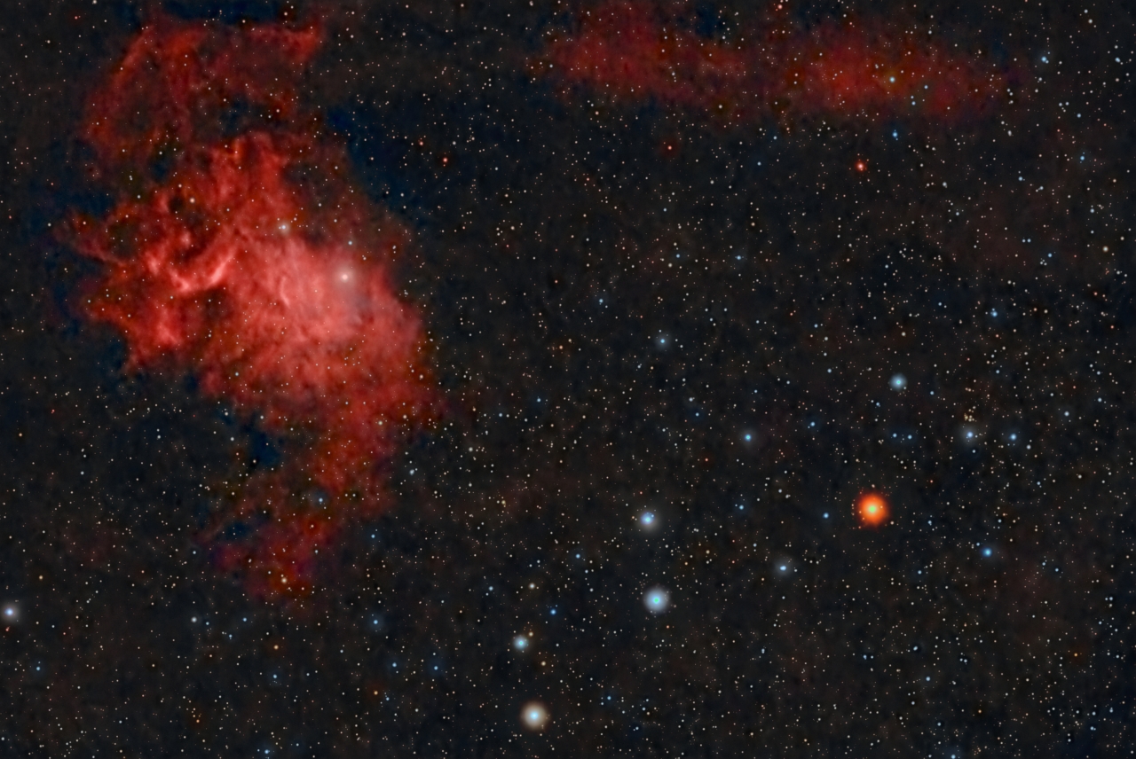 IC 405 and IC 410 form a physically related star-forming nebula complex in Auriga, seen in the same rich Milky Way field. IC 405 (the Flaming Star Nebula / Sh2-229 / Caldwell 31) is a mixed emission + reflection nebula whose glow and blue reflection haze are powered primarily by the embedded runaway star AE Aurigae (HD 34078). Modern distance estimates place IC 405 at roughly ~1,500 light-years (~460 pc), putting it in the foreground of the more distant Auriga star-forming regions. IC 405 was discovered photographically on 21 March 1892 by Johann Martin Schäberle (with later photographs the same year by Max Wolf and Eugen von Gothard), which is a nice historical reminder of how early astrophotography rapidly expanded the nebula catalog beyond what visual observers could reliably detect.