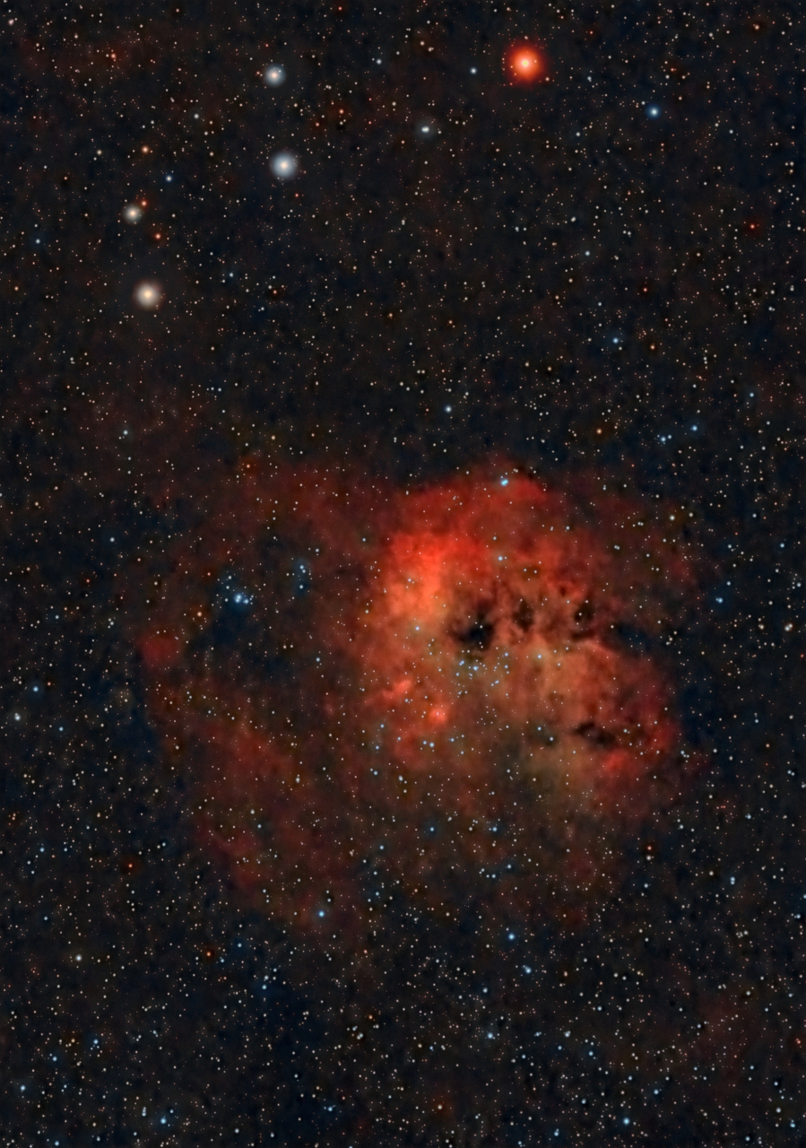 Just a few degrees away on the sky—but much farther in true distanceIC 410 (the Tadpoles Nebula) is an H II region surrounding the very young open cluster NGC 1893. IC 410/NGC 1893 lie at about ~12,000 light-years (~3.7–3.9 kpc) in the outer Milky Way direction, with the cluster age commonly cited near ~4 million years and a total young stellar population estimated at ~4,600 young stellar objects from X-ray/infrared studies. The nebula spans on the order of ~100 light-years, and its famous “tadpoles” (dark, cometary globules, often labeled Simeis 129 & 130) are dense knots of gas and dust being photoevaporated and shaped by stellar winds and radiation from the cluster’s massive, hot stars—direct, photogenic evidence of feedback processes that regulate star formation. The cluster itself was discovered by John Herschel on 22 January 1827, while the surrounding nebulosity IC 410 was identified later, photographically on 25 September 1892 by Max Wolf.